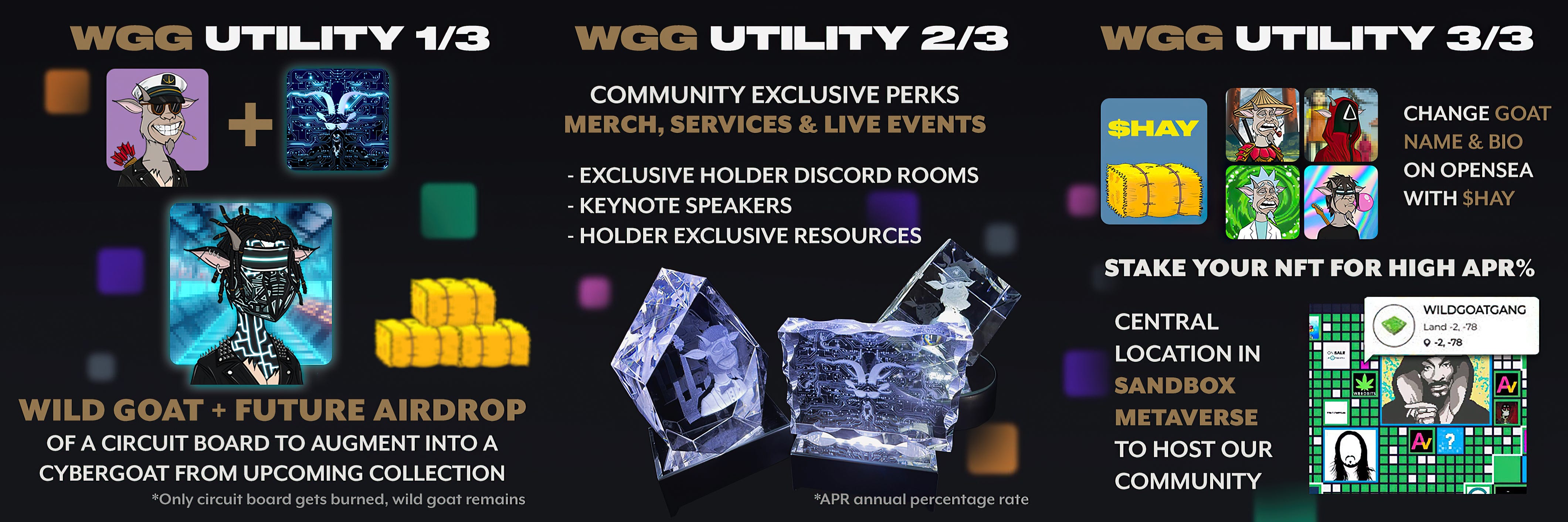 Holders of a Wild Goat will be airdropped a circuit board that will allow you to augment your Wild Goat NFT, into a Cyber Goat living in a hyper-futuristic, neon cityscapes, dystopian future.